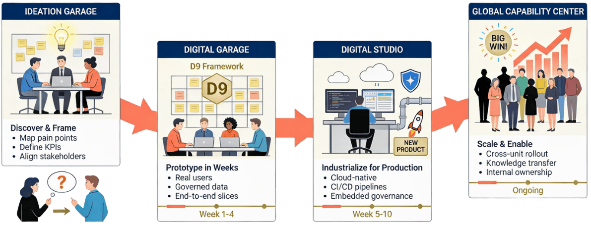 Four proven stages that transform AI ideas into scaled production systems in weeks powered by reusable innopas accelerators